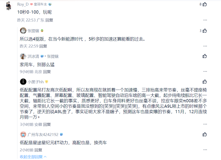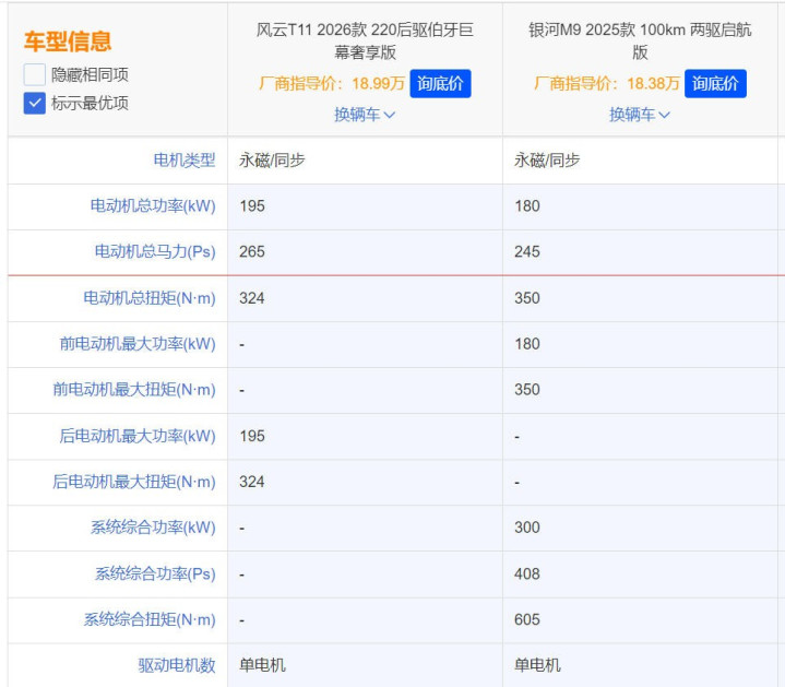 从网友们的反馈来看,很多人普遍认为,风云T11两驱版车型的动力表现太差劲了。而原因就是,由于其是一台增程式混合动力车型,所以风云T11后驱版车型的电机总功率只有265马力,加速近10秒级。反观采用插电式混合动力的银河M9,虽然电机总功率也只有245马力,但得益于1.5T发动机能同时做功,其系统综合功率就能达到408马力,零百加速7.7秒,妥妥的8秒级选手。这样一对比,网友自然就会觉得两驱版风云T11的动力是偏弱的了。