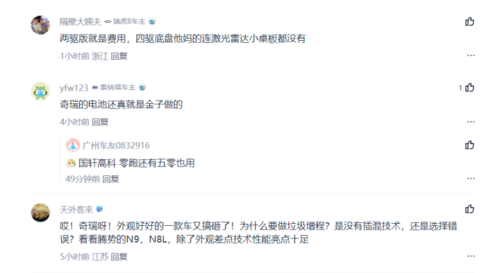 除了主销车型动力较弱,还有网友吐槽风云T11四驱低配版本(220四驱双IMAX影院版)没有配备激光雷达和后排小桌板。要知道,风云T11这个低配四驱版本的指导价可是来到了22.99万,却连个好的智能辅助驾驶系统都没有,也就难怪某些网友会破防了。